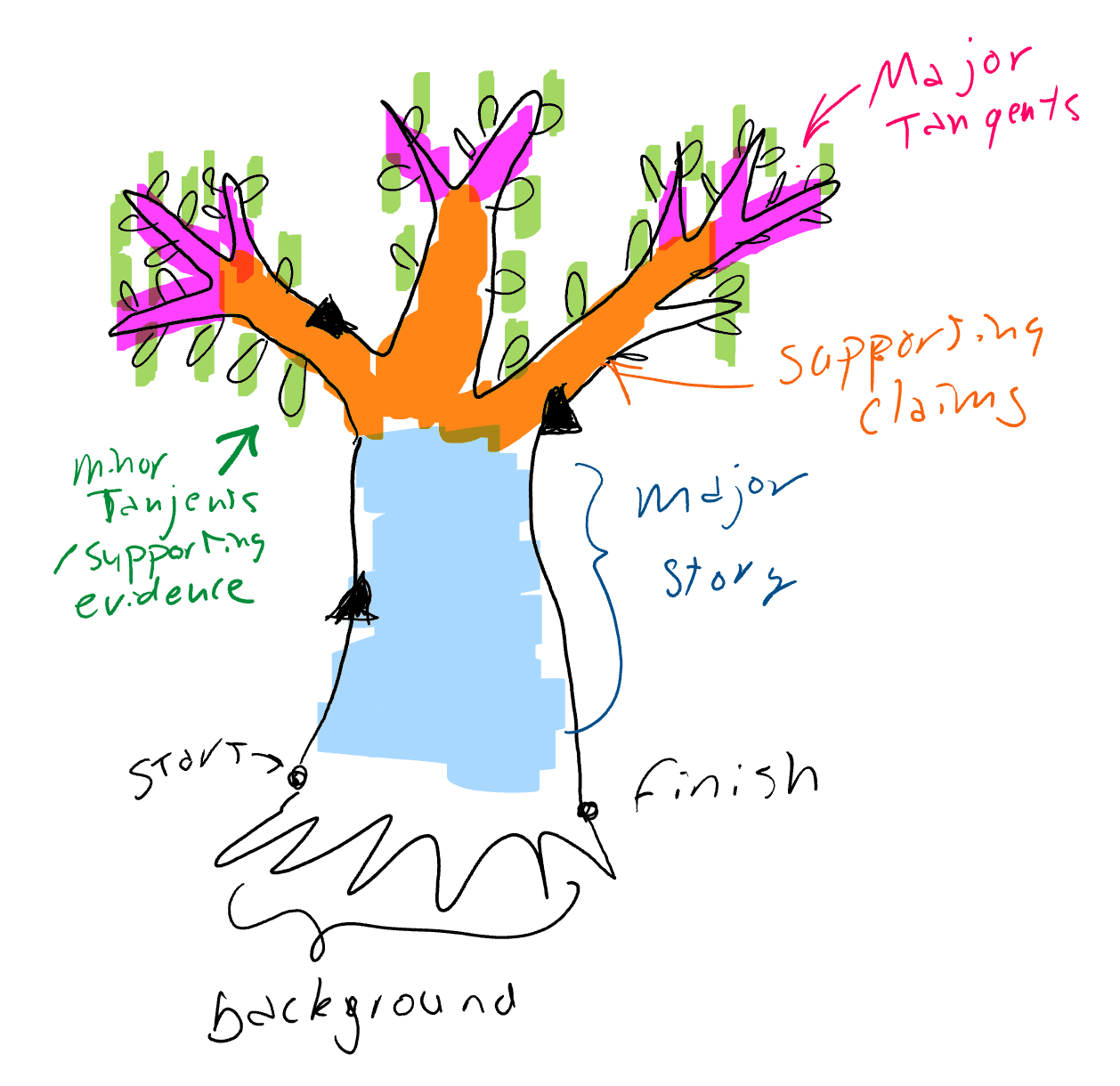 This may remind you very much of a lemma in a math proof. If you’ve ever seen a long math proof (a large code base also has this structure), you know the structure of lemma, lemma, lemma, …, proof! (or function, function, function, main!) A presentation’s core argument is no different, it’s just ordered a little different. Again, your audience can’t go back and re-read the lemma, they need to know its proof as it appears, like how good math professors lecture. A good math lecture will state the goal and then work until a smaller, new, often repeated problem appears. They’ll then generally solve that sub-problem in a lemma and then pop up and apply the lemma to the proof argument. Similarly, your drawn tree will have a lot of similarly structured branches. Each of them gives its own shade though :).